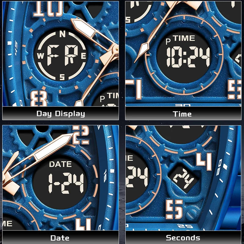 💎Features: Stop Watch, Shock Resistant, LED Display, Luminous, Auto Date, Chronograph, Complete Calendar, Water-Resistance, Alarm, Week Display, Luminous Hands
