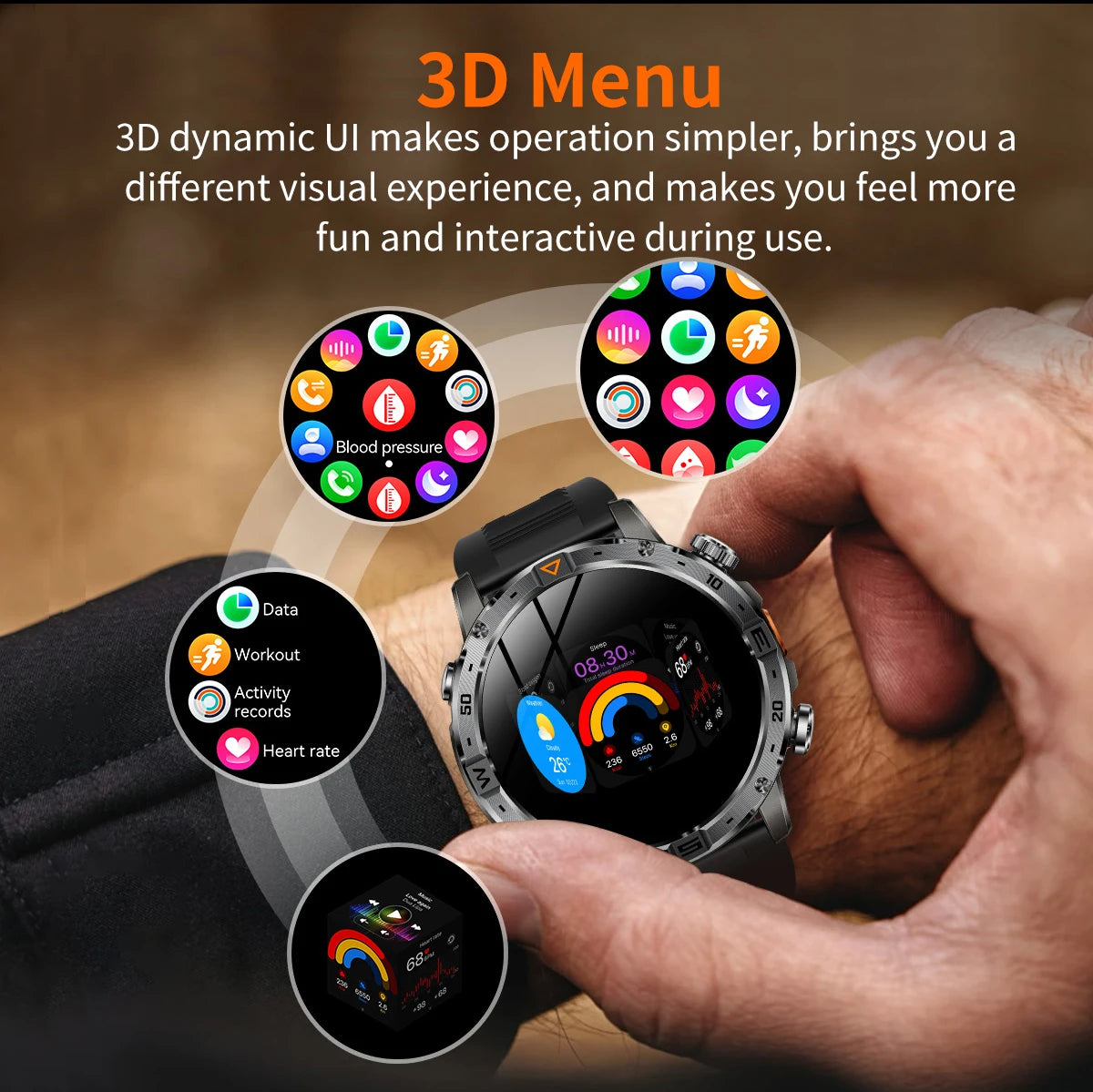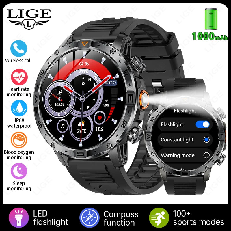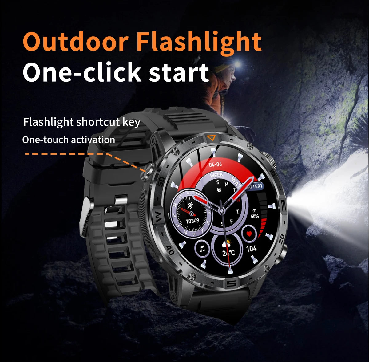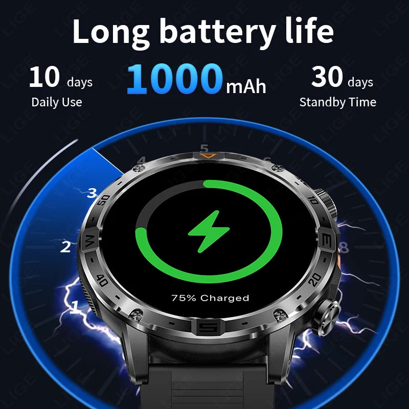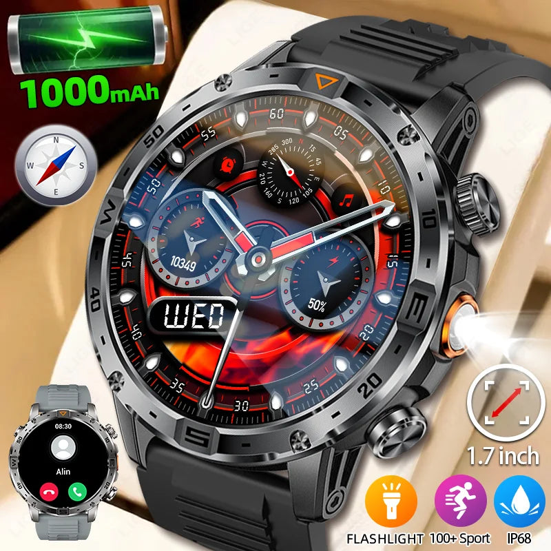 Designed for men who demand performance, durability and intelligence from their technology, this long-standby smartwatch with ultra-high battery capacity delivers reliability in every situation. Featuring a large 1.7-inch HD display, Bluetooth calling, built-in LED flashlight and compass, it is the perfect companion for daily life, outdoor adventures and intense training sessions. With its bold round design and advanced health and fitness features, this smartwatch keeps you informed, active and in control—day and night.