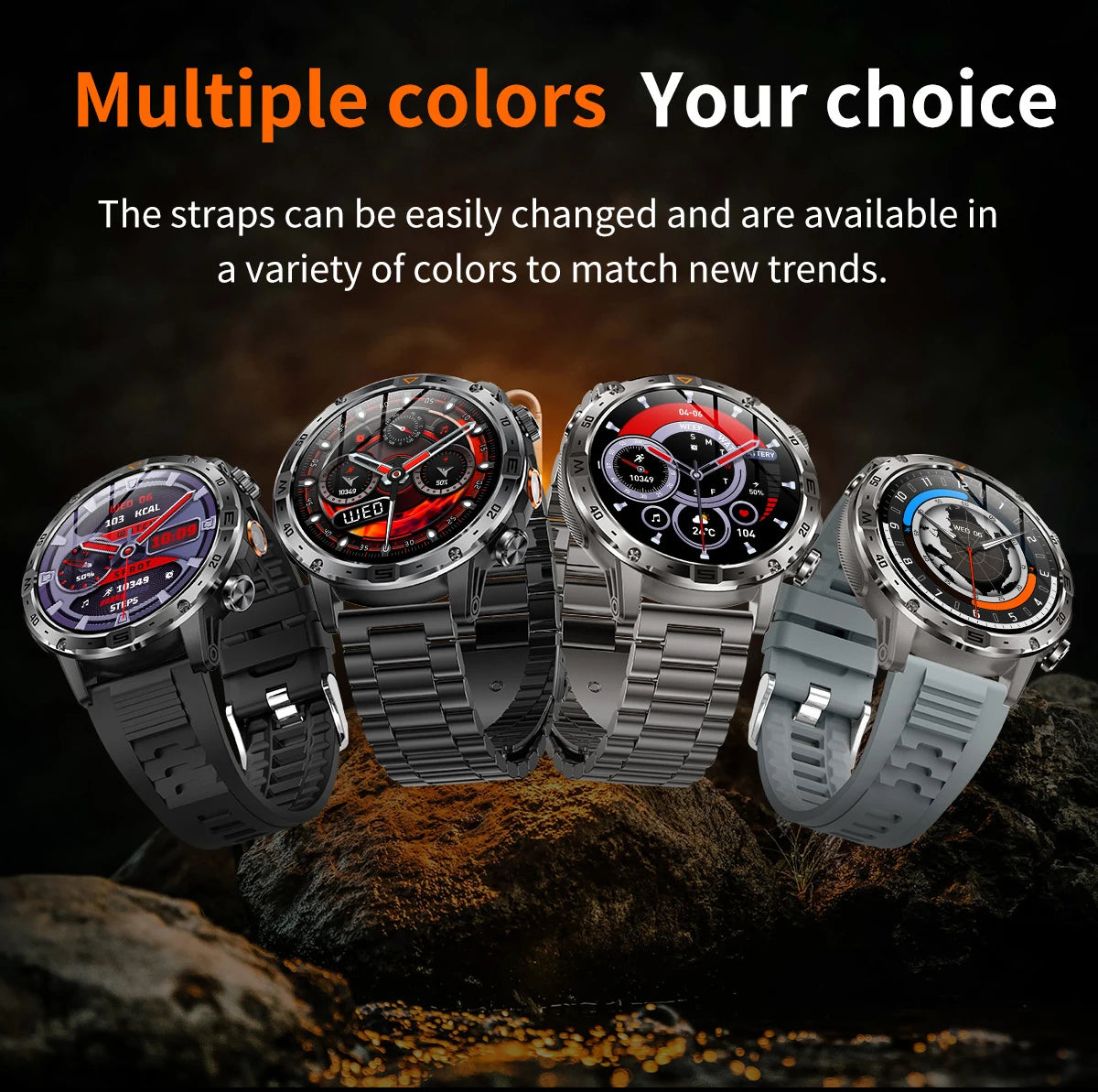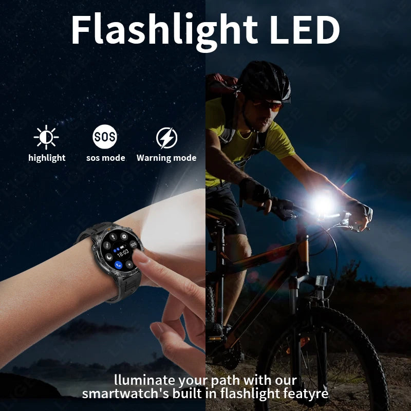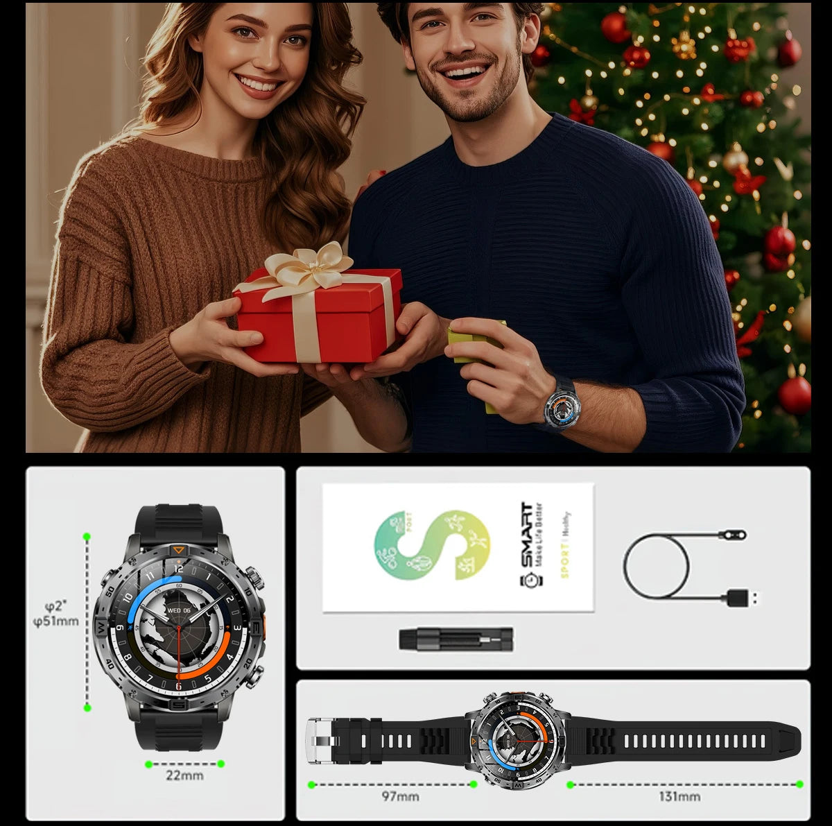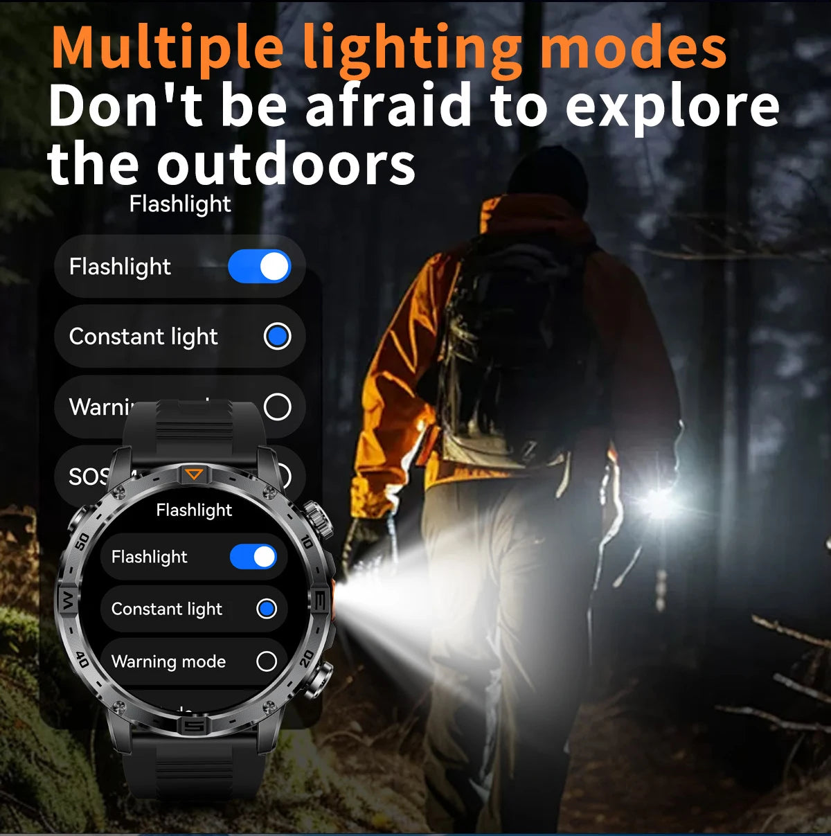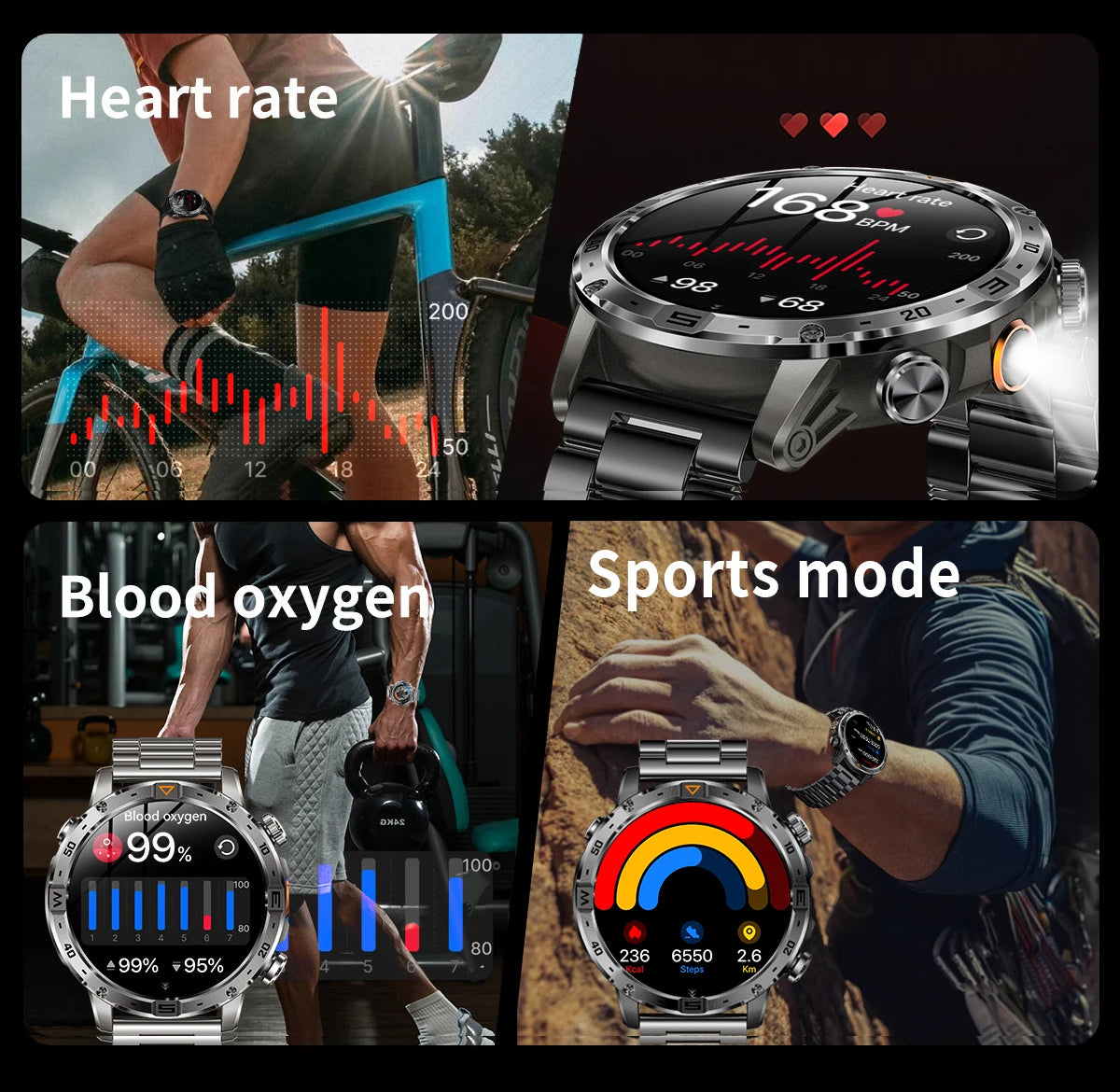 Designed for men who demand performance, durability and intelligence from their technology, this long-standby smartwatch with ultra-high battery capacity delivers reliability in every situation. Featuring a large 1.7-inch HD display, Bluetooth calling, built-in LED flashlight and compass, it is the perfect companion for daily life, outdoor adventures and intense training sessions. With its bold round design and advanced health and fitness features, this smartwatch keeps you informed, active and in control—day and night.